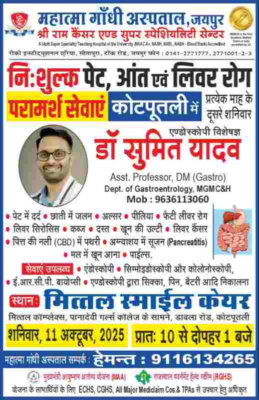 राजस्थान: निःशुल्क पेट आंत व लिवर रोग परामर्श शिविर 11 अक्टूबर को