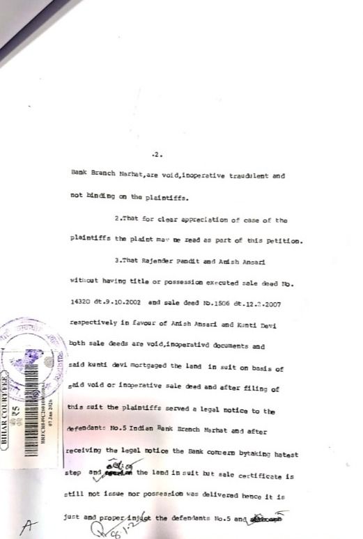 बिहार: नवादा में विवादित भूमि पर Sale Certificate रोकने की मांग, इंडियन बैंक को कोर्ट का शो-कॉज नोटिस। नवादा (बिहार) नवादा ज़िले के नरहट थाना क्षेत्र अंतर्गत ग्राम शेखपुरा स्थित खाता संख्या 119, प्लॉट संख्या 446 की भूमि को लेकर गंभीर कानूनी विवाद सामने आया है। इस भूमि पर इंडियन बैंक द्वारा की गई ई-नीलामी के विरुद्ध सिविल कोर्ट, नवादा में मामला विचाराधीन है। वाद में याचिकाकर्ता अनवर हुसैन (पिता स्व. अब्दुल अज़ीज़) ने अदालत के समक्ष यह स्पष्ट किया है कि उक्त भूमि पर पूर्व से ही स्वामित्व विवाद लंबित है तथा जिस आधार पर बंधक व नीलामी की प्रक्रिया अपनाई गई, वह कानूनन संदेहास्पद है। कोर्ट ने लिया संज्ञान, बैंक को शो-कॉज नोटिस। मामले की गंभीरता को देखते हुए सब-जज V, नवादा की अदालत ने इंडियन बैंक (नरहट शाखा) को Show Cause Notice जारी कर दिया है। महत्वपूर्ण बात यह है कि यह नोटिस कोर्ट रजिस्ट्री द्वारा विधिवत भेजा जा चुका है, जिसकी रसीद याचिकाकर्ता के पास उपलब्ध है। Sale Certificate पर रोक की मांग। तो उस अवधि में किसी भी प्रकार का यथास्थिति बदलने वाला कदम न्यायिक अनुशासन के विरुद्ध माना जाता है। सामाजिक पृष्ठभूमि भी चर्चा में। गौरतलब है कि अनवर हुसैन गांव के उन सामाजिक कार्यकर्ताओं में रहे हैं जिन्होंने वर्षों से अराजकता, जातीय भेदभाव और शोषण के विरुद्ध आवाज़ उठाई। वे ग्राम स्तर पर गठित सामाजिक संगठनों से भी जुड़े रहे हैं, जिसके कारण यह मामला सामाजिक और कानूनी दोनों स्तरों पर चर्चा का विषय बन गया है। अब सबकी निगाहें 22 जनवरी पर।