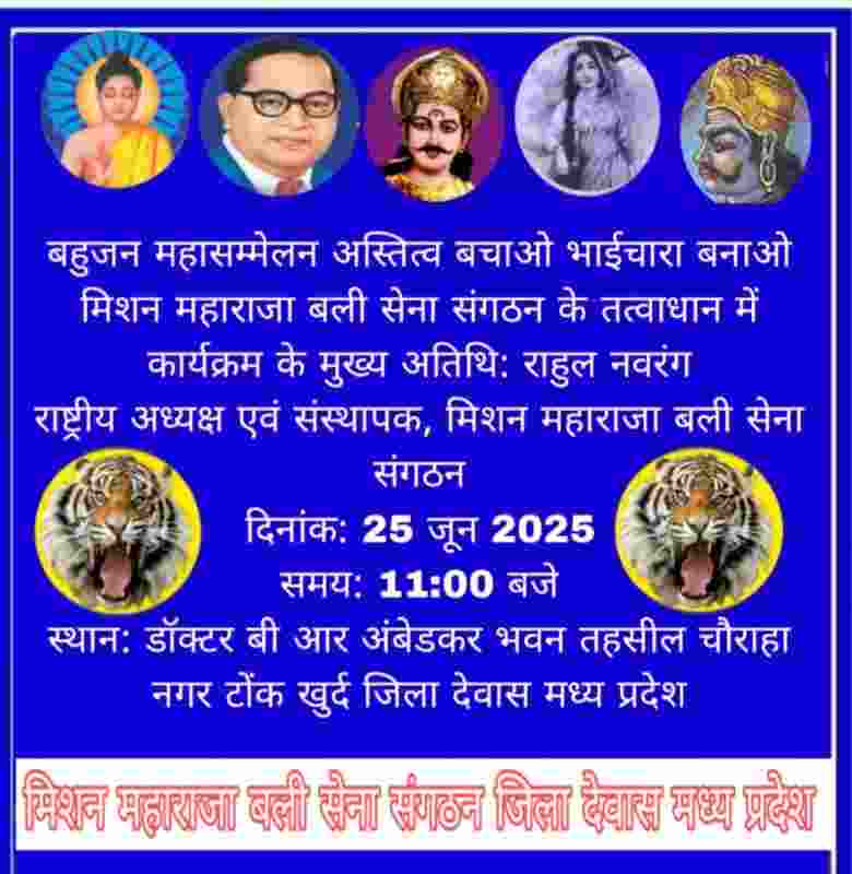 मध्य प्रदेश: इस सम्मेलन में सामाजिक न्याय, आरक्षण, और लोकतंत्र के विभिन्न मुद्दों पर चर्चा की जाएगी। सम्मेलन के मुख्य वक्ता और मिशन महाराजा बली सेना संगठन के राष्ट्रीय अध्यक्ष राहुल नवरंग ने कहा, "यह सम्मेलन सामाजिक न्याय और समानता के मुद्दों पर चर्चा करने और समाधान खोजने के लिए एक महत्वपूर्ण मंच होगा आरक्षण और संविधान पर विश्लेषणवर्तमान शासन व्यवस्था आरक्षण को निष्प्रभावी करने तथा संविधान की मूल भावना को कमज़ोर करने में लगी हुई है। हमें परम पूज्य बाबा साहेब डॉ. भीमराव अम्बेडकर द्वारा प्रदत्त संवैधानिक अधिकारों की रक्षा के लिए सतत जागरूक और संगठित रहना होगा। EVM प्रणाली का लोकतंत्र पर प्रभाव इलेक्ट्रॉनिक वोटिंग मशीन (EVM) के माध्यम से चुनाव कराना लोकतंत्र की पारदर्शिता और जनविश्वास के विरुद्ध है। यह व्यवस्था शासक वर्ग के षड्यंत्र का हिस्सा प्रतीत होती है, जिसका उद्देश्य चुनाव प्रक्रिया को नियंत्रित करना है। दलित, पिछड़े, आदिवासी वर्ग एवं अल्पसंख्यकों व मुस्लिमों पर बढ़ते अत्याचार_: वर्तमान समय में अनुसूचित जाति, जनजाति, पिछड़ा वर्ग और मुस्लिम समाज पर होने वाले अत्याचारों में चिंताजनक वृद्धि हो रही है। यह न केवल संवैधानिक मूल्यों पर आघात है, बल्कि सामाजिक ताने-बाने को भी छिन्न-भिन्न करने वाला संकट है।