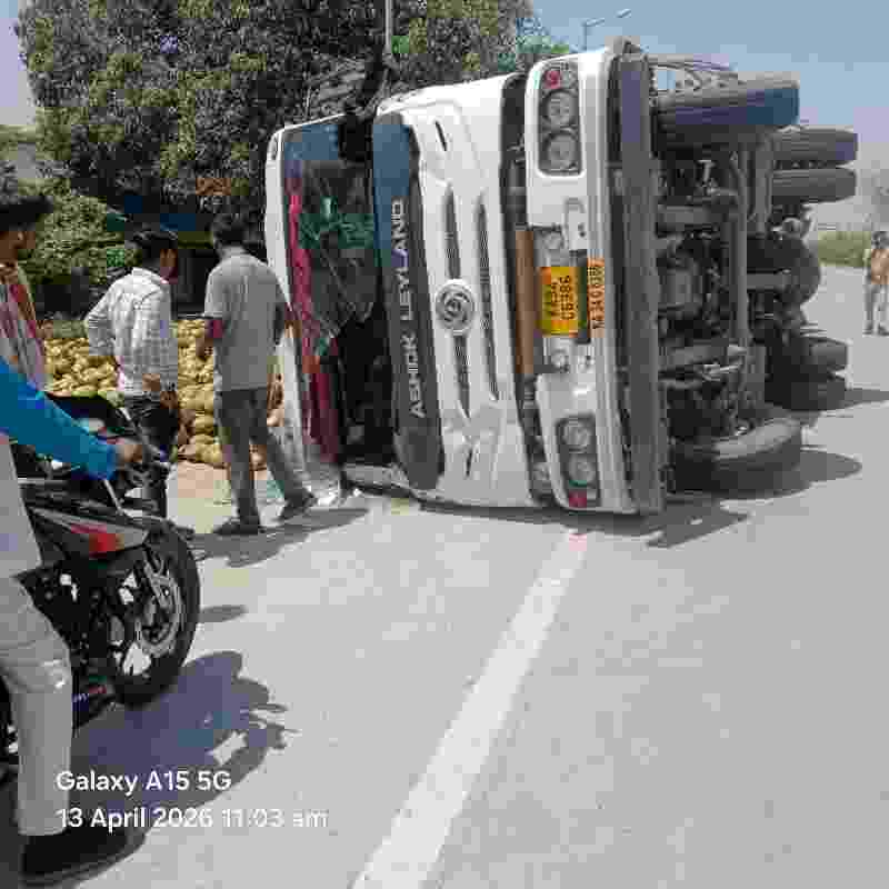 उत्तर प्रदेश: मिर्जापुर–वाराणसी मार्ग पर ट्रक पलटा, बड़ा हादसा टला; यातायात प्रभावित