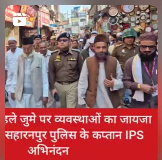 उत्तर प्रदेश: सहारनपुर के वरिष्ठ पुलिस अधीक्षक अभिनंदन सिंह द्वारा पवित्र महीने रमजान के प्रथम जुम्मे की नमाज को शांतिपूर्ण सुरक्षित संपन्न कराए जाने के उद्देश्य से किया निरीक्षण। आज दिनांक 20/ 02/2026 को पवित्र महीने रमजान के पहले जुम्मे की नमाज को शांतिपूर्ण, सुरक्षित रुप से संपन्न कराए जाने के उद्देश्य से आज वरिष्ठ पुलिस अधीक्षक सहारनपुर द्वारा थाना कोतवाली नगर क्षेत्र का स्थलीय निरीक्षण किया गया। और सहारनपुर में विभिन्न स्थानों पर पहुंचकर मोके का जायजा लिया । सहारनपुर के वरिष्ठ पुलिस अधीक्षक अभिनंदन सिंह ने ड्यूटी पर तैनात पुलिस बल को पूर्ण सतर्कता बरतने प्रभावी प्रबंधन सुनिश्चित करने के आदेश दिया। और अफवाहों पर कड़ी निगरानी रखने के आदेश दिए।