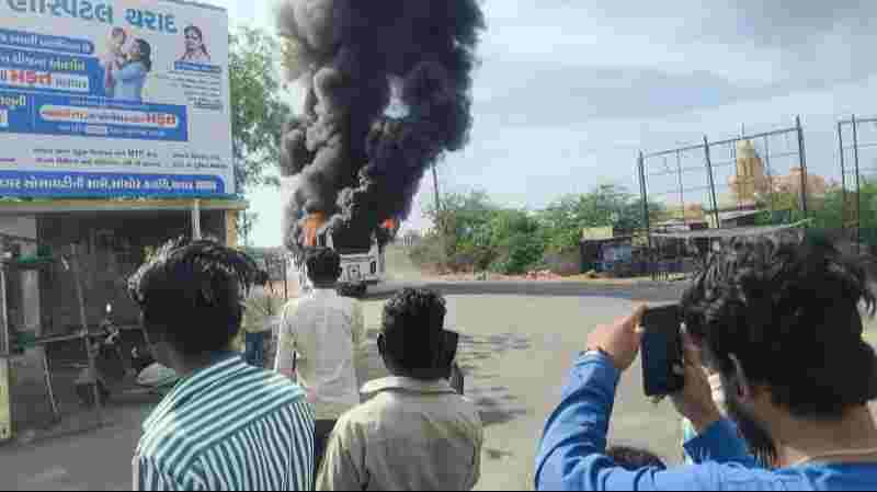 गुजरात: ढीमा चार रास्ता पर बस में भीषण आग, बिना परमिट बसों पर कार्रवाई की मांग तेज