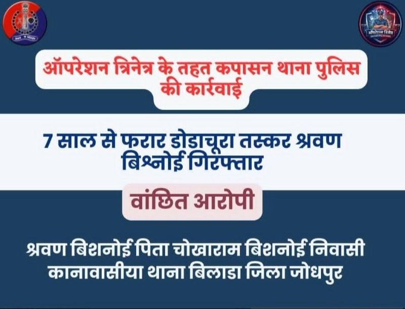 राजस्थान: 7 साल से फरार डोडाचूरा तस्कर श्रवण बिश्नोई गिरफ्तार, ऑपरेशन त्रिनेत्र में बड़ी कार्रवाई