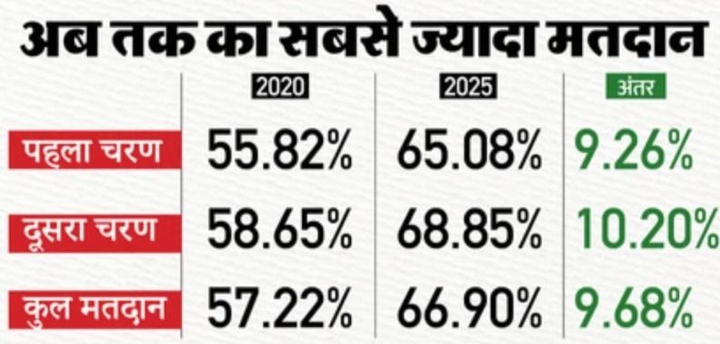 उत्तर प्रदेश: बिहार विधानसभा चुनाव 2025: 66.9% मतदान, पांच दशक में सबसे ऊँचा रुझान
